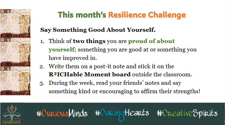 Mental well-being is key to overall health and development. A Resilient Me is a joint collaboration between Character and Citizenship Education (CCE) and Student Mangement (SM) Departments to build a school culture where students feel safe and supported through promoting positive mindsets and mental well-being. Peer Suport Leaders and Prefects introduce monthly mental resilience quotes and explicit teaching on the applications of the quotes in learning is taught during morning Engagement Time. Students take on monthly resilience challenges, helping them build stronger coping skills and adapt more effectively to challenges.